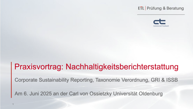 Kürzlich durften wir Kristina Flatken sowie die Sustainability-Auditoren Erika Müller und Moritz Arends von der Commerzial Treuhand Oldenburg in unserer Bachelorvorlesung Financial Accounting begrüßen. Im Gepäck: Ein kompakter Überblick zu CSRD, EU-Taxonomie-Verordnung, GRI und ISSB, ergänzt durch viele Einblicke aus der täglichen Beratung. Dabei wurde auch diskutiert, was die aktuelle Omnibus-Initiative der EU für Unternehmen bedeutet und warum Nachhaltigkeitsberichterstattung trotzdem ein wichtiges Thema bleibt.