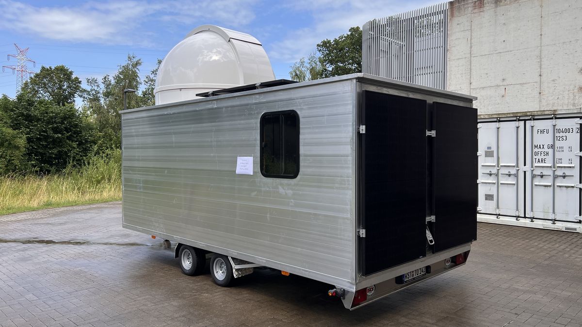 Bereits von außen betrachtet fällt sofort auf, dass dies kein normaler Anhänger ist: Der silberfarbene Kasten auf Rädern trägt nicht nur Photovoltaikanlagen an Türen und Dach, sondern auch eine markante weiße Kuppel auf dem Dach. Unter dieser befindet sich im Inneren des Anhängers ein Hebestativ, auf dem zwei Teleskope montiert sind. Hinzu kommen ein Beamer, eine große Leinwand und Sitzbänke. Diese Ausstattung macht das ungewöhnliche Konstrukt zu dem, was es ist: das „Tiny Observatorium“. In der mobilen Sternwarte können interessierte Bürgerinnen und Bürger unter fachlicher Anleitung selbst durch das Teleskop schauen oder auf der Leinwand das Geschehen im All verfolgen.