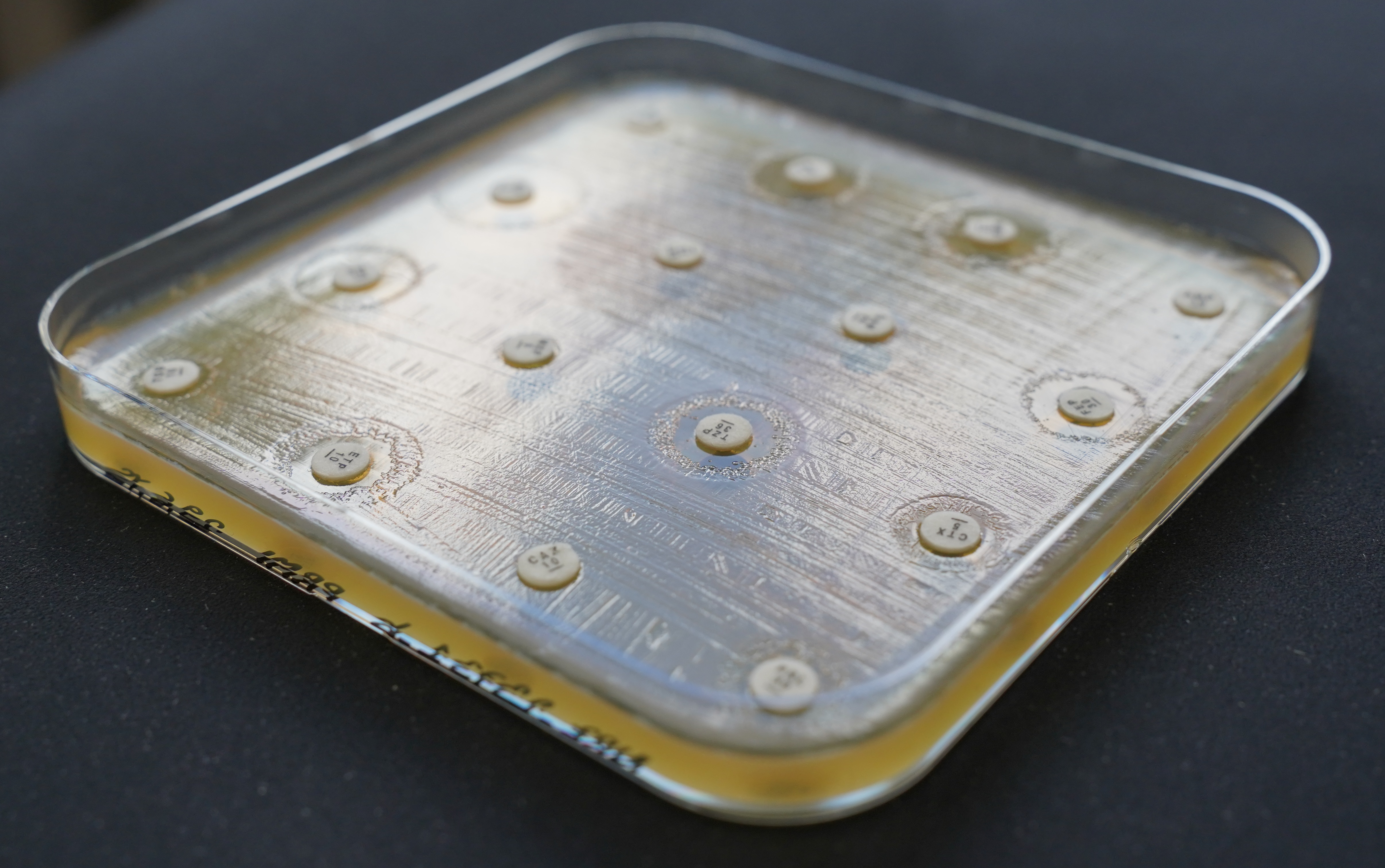 Treffen Antibiotikaplättchen auf eine Bakterienkultur, entstehen um sie herum Hemmzonen, in denen das Bakterienwachstum unterdrückt wird. Anhand der Durchmesser dieser Kreise und der Kombinationen von Hemmzonen können Forschende und Labormitarbeitende mit dem neuen KI-Modell berechnen, ob das Bakterium voraussichtlich resistent gegen ein Reserveantibiotikum ist. Foto: Axel Hamprecht