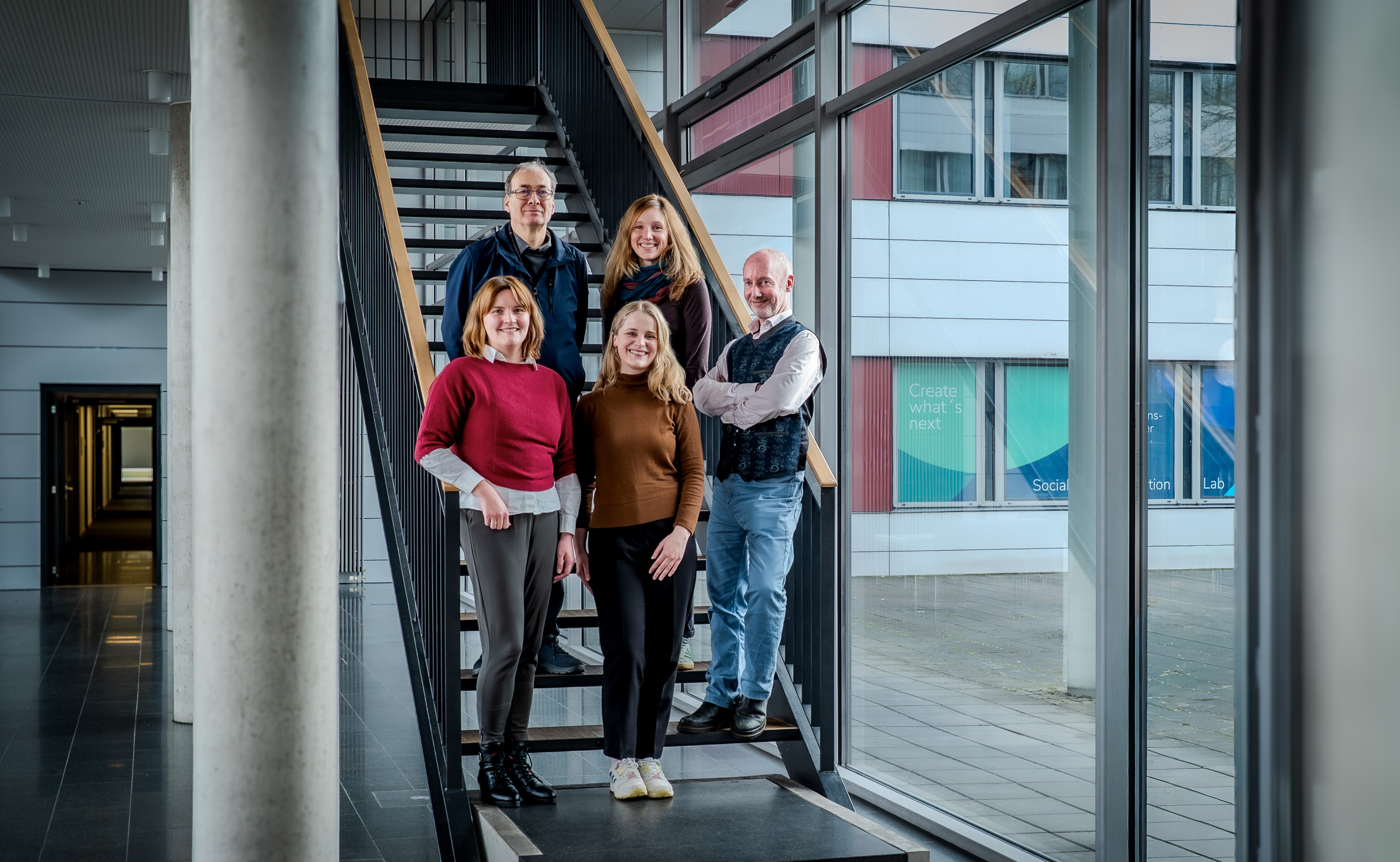 Projektleiter Prof. Dr. Jörg Peters (h.l.), Janna Sanders (v.M.) und Dr. Heike Schoormann (h.r.) forschen zu Saterfriesisch sprechenden Familienverbänden. Unterstützt wird das Projekt von Dr. Henk Wolf (v.r.) und Veronika Pugge (v.l.) vom Seeltersk-Kontoor. Foto: Universität Oldenburg/ Anna Tenge
