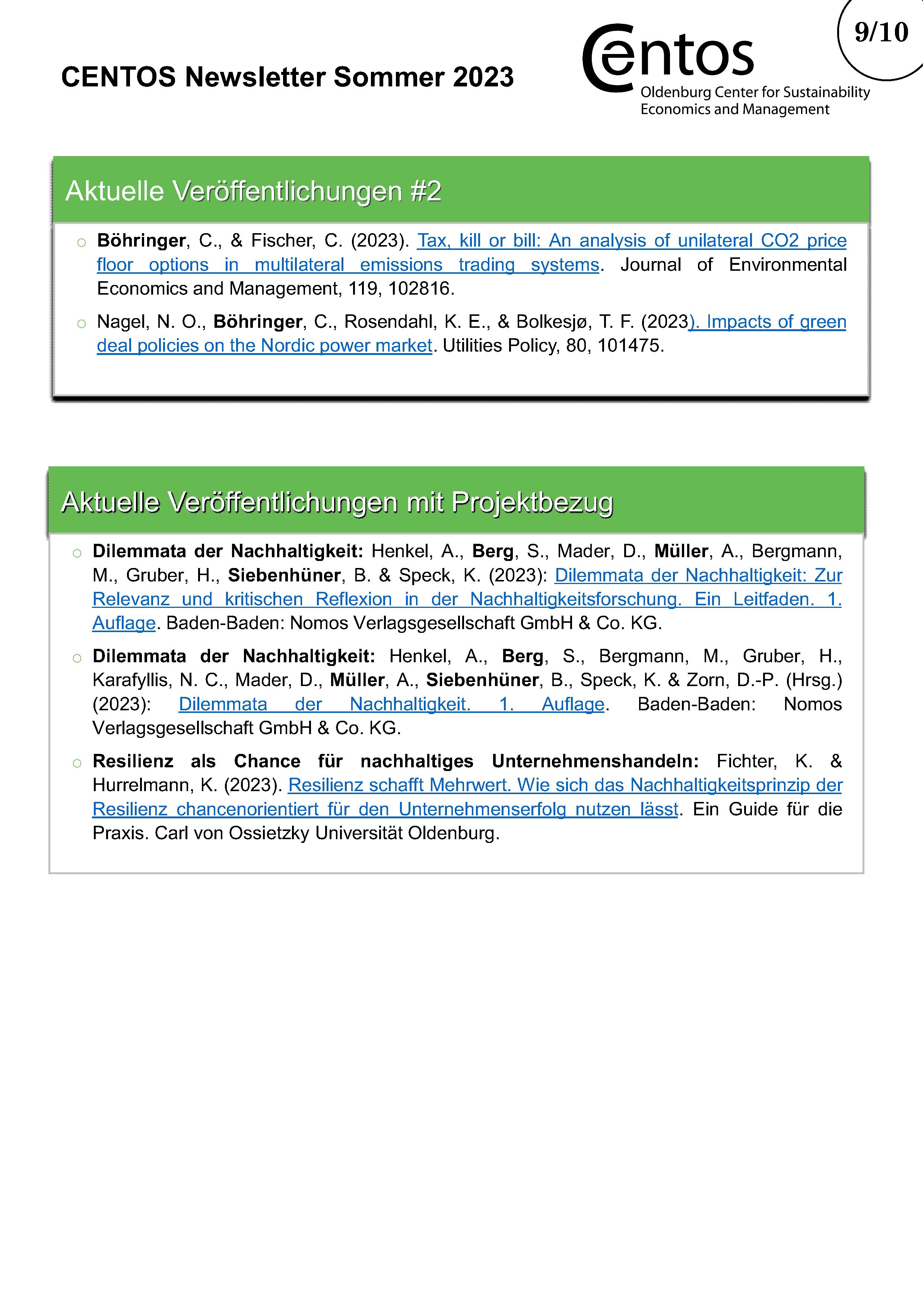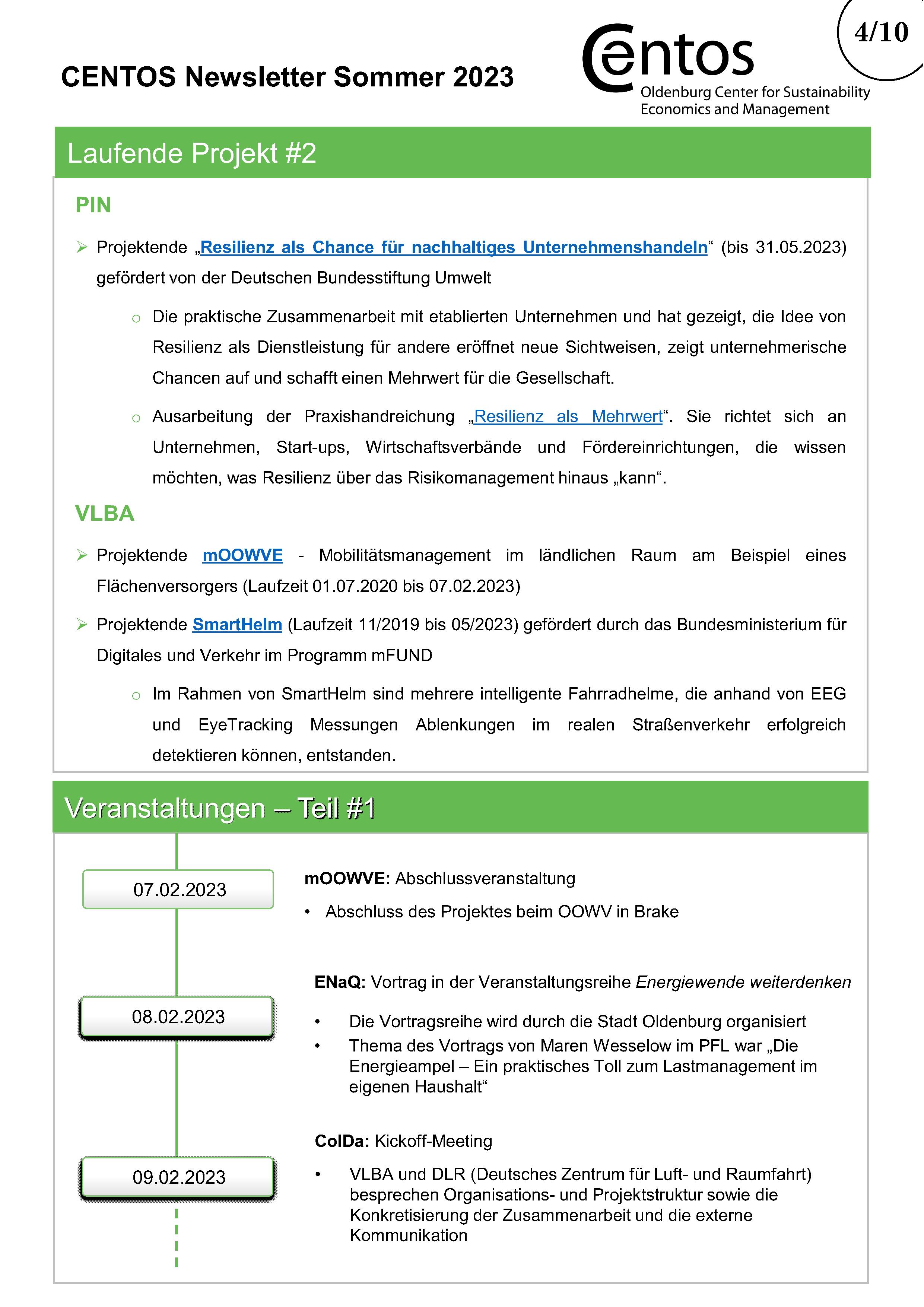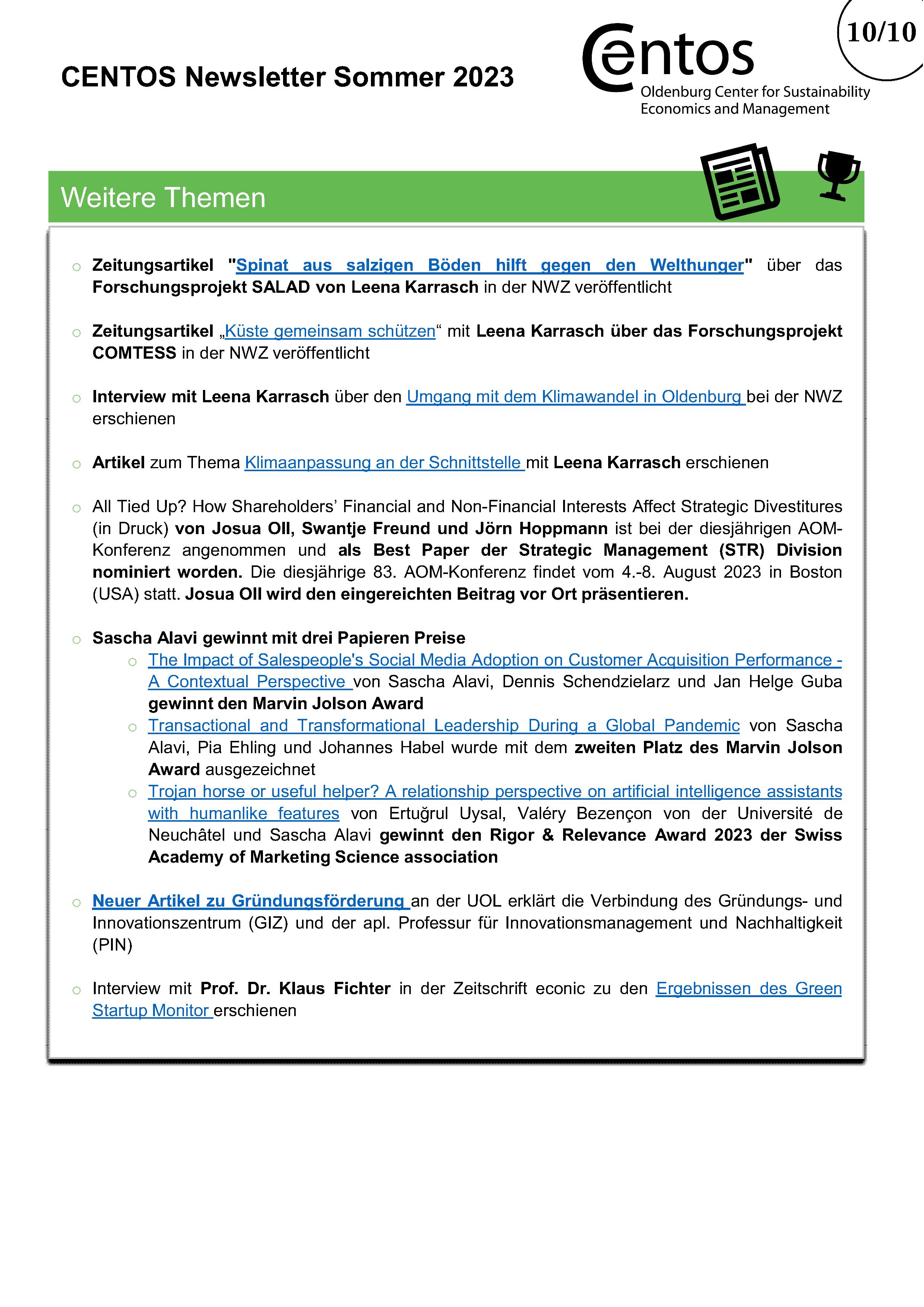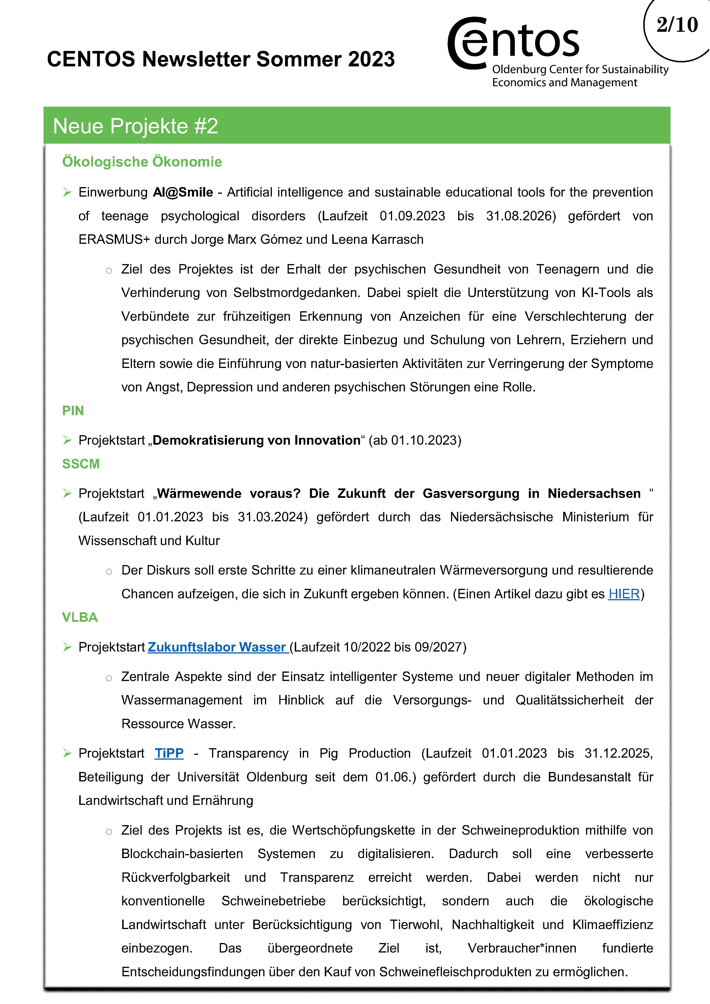 Im halbjährlichen CENTOS-Newsletter werden Informationen über bestehende und neue Projekte der CENTOS-Arbeitsgruppen und Lehrstühle veröffentlicht. Daneben gibt der Newsletter einen Überblick über die Publikationen der Mitglieder mit Verlinkung zum Nachlesen. Am Ende des Newsletters gibt es Platz für besondere Ehrungen für Projekte oder Publikationen.