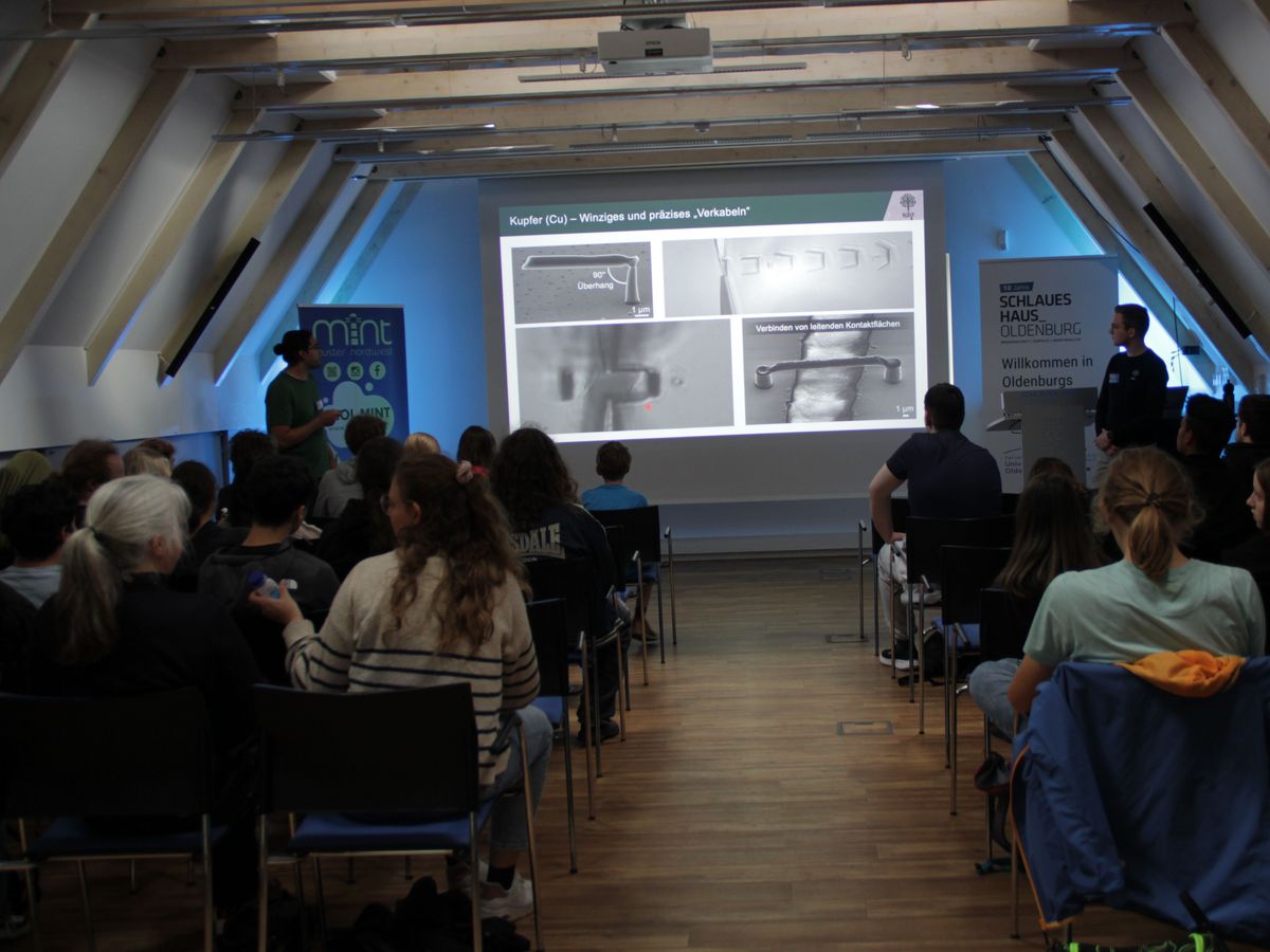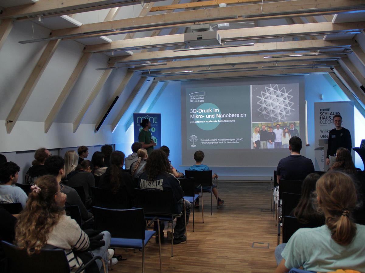 Unter dem Titel „3D-Druck im Nanobereich und der Chemie” haben Karuna Aurel Kanes und Simon Sprengel, Mitarbeiter der Arbeitsgruppe Prof. Dr. Dmitry Momotenko einen Familienvortrag gehalten und haben dabei das Folgende angesprochen: