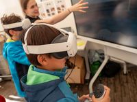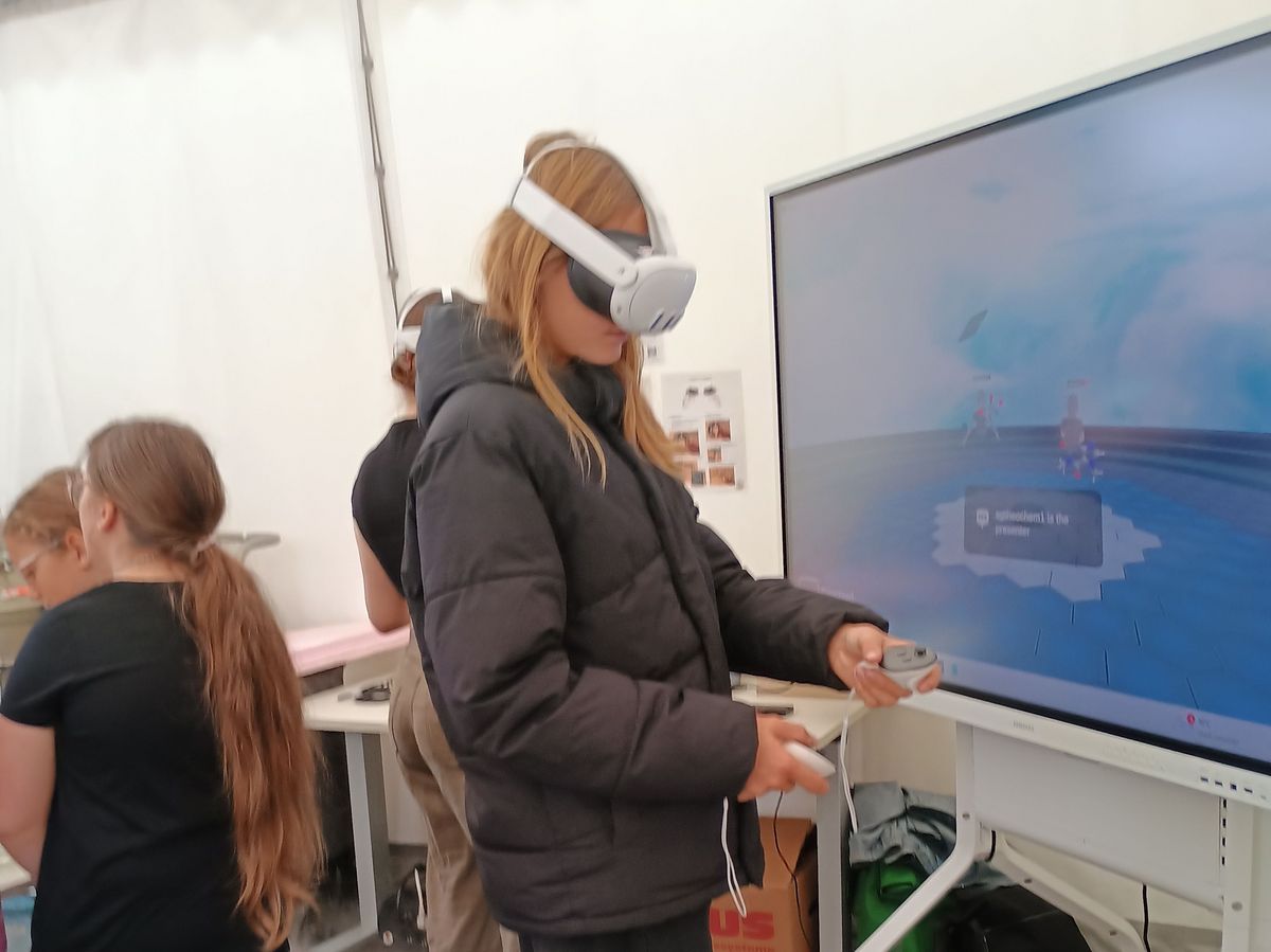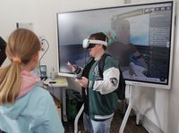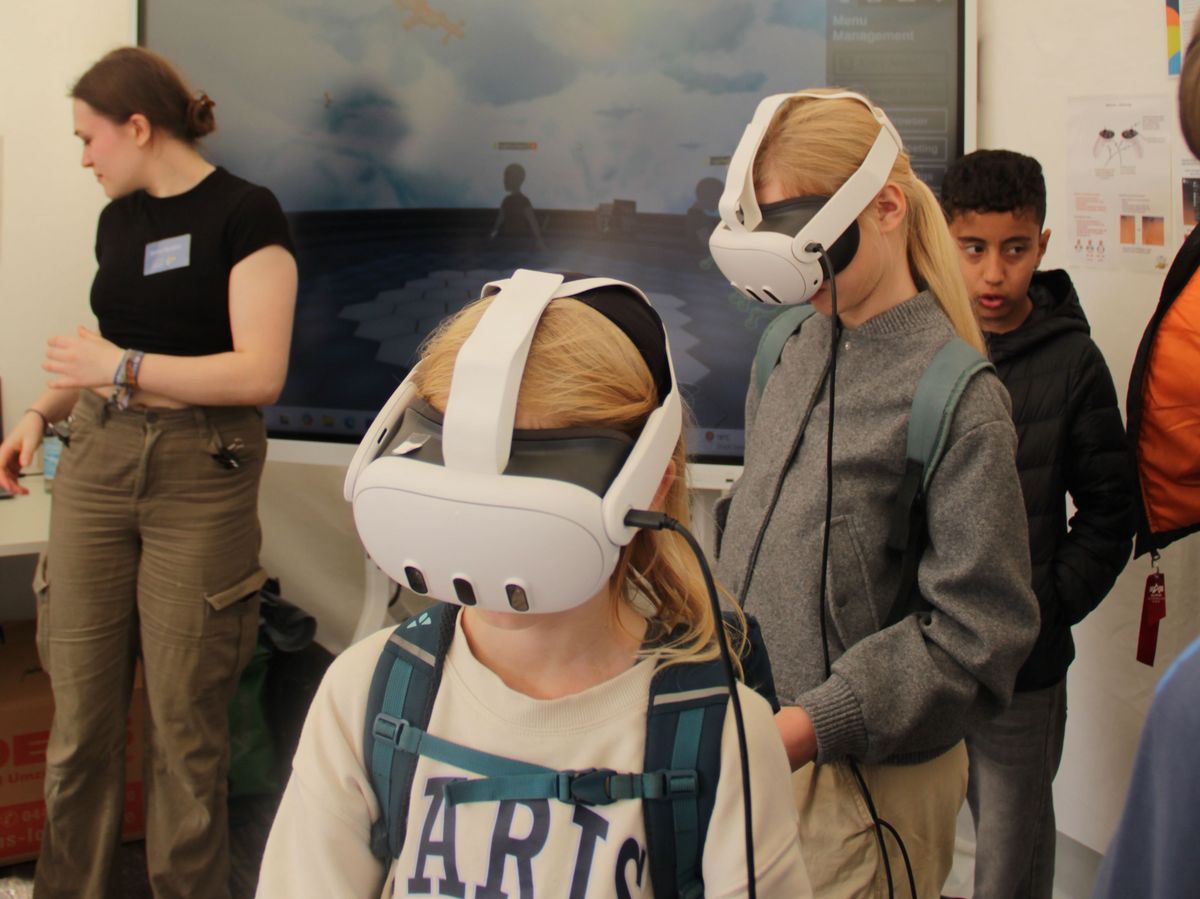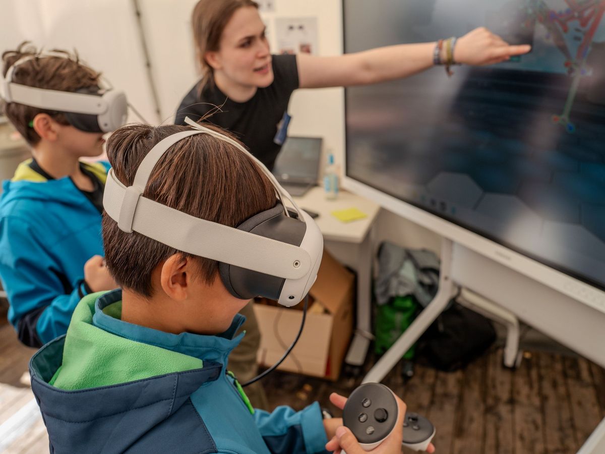 Ein noch tieferes Eintauchen in die Materie wird mit zwei VR-Brillen möglich. Die Brillen sind mit der Software „Nanome“ ausgestattet, welche es erlaubt, in einem gemeinsamen virtuellen Raum mit verschiedenen Molekülen zu interagieren. Kleine Moleküle oder komplexe Strukturen wie Proteine können nicht nur betrachtet werden; sie können auch gedreht, skaliert und mittels integriertem Molekülbaukasten auch verändert werden. Mit digitalen Werkzeugen lassen sich Bindungslängen und -winkel präzise vermessen oder Ladungsdichten visualisieren. Außerdem bietet der integrierten Molekülbaukasten die Möglichkeit, eigene Moleküle zu konstruieren. Damit auch die Zuschauer*innen an diesem Erlebnis teilhaben können, wird das Geschehen aus der virtuellen Welt live auf eine Projektionsfläche übertragen.