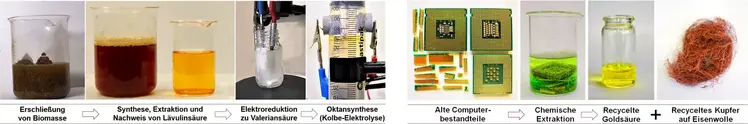 Themenfeld 2: Ökologische und Nachhaltige Chemie & Green Chemistry Der zweite inhaltliche Schwerpunkt umfasst das Themenfeld der ökologischen, nachhaltigen und grünen Chemie. Hier fokussieren wir Fragestellungen wie etwa die Gewinnung von (1) Energieträgern (Second-Generation-Biofuels) sowie (2) Plattformchemikalien aus nachhaltigen Quellen, wie Biomasse. Darüber hinaus untersuchen wir auch Themenfelder wie (3) das Recycling von kritischen (Edel-)Metallen aus Schrott oder auch (4) Abwasserreinigung von Schwermetall-Ionen oder organischen Verunreinigungen. Seit 2021 beschäftigen wir uns mit der Synthese von „grünem” Wasserstoff mit sichtbarem Licht als Teil des SFB/Transregio CataLight.