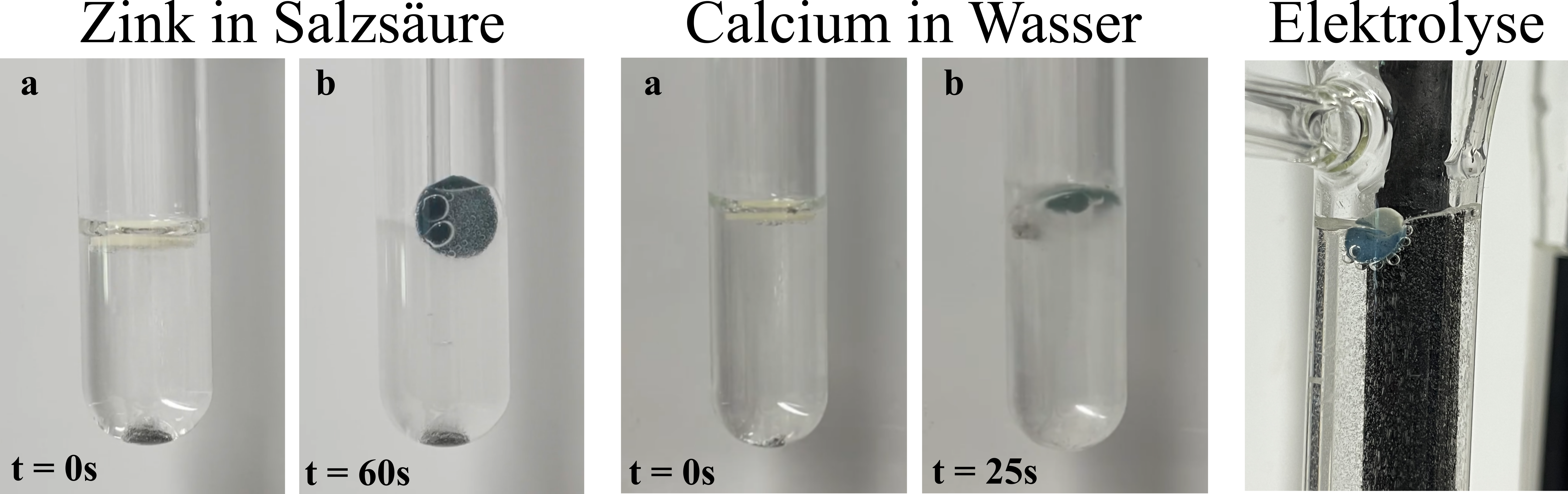 Die Wasserstoff-Nachweisfolie bietet die Möglichkeit, verschiedene Experimente in der Schule zu erweitern. Durch die Verwendung von PDMS als Trägermaterial kann die Nachweisfolie sowohl in der Gasatmosphäre als auch direkt in der Reaktionslösung eingesetzt werden. Bei der Zugabe in die Reaktionslösung kann sie innerhalb von unter einer Minute den sich bei der Reaktion eines unedlen Metalls mit einer Säure oder eines (Erd-)Alkalimetalls mit Wasser bildenden Wasserstoff nachweisen (siehe Abbildung). Alternativ kann eine Nachweisfolie am Boden eines Reagenzglases mit Sekundenkleber befestigt und ergänzend zur Knallgasprobe genutzt werden. Die blaue Färbung der Nachweisfolie detektiert hierbei nicht nur den Wasserstoff, sondern gibt auch eine Indikation, ab wann die Knallgasprobe positiv abläuft.