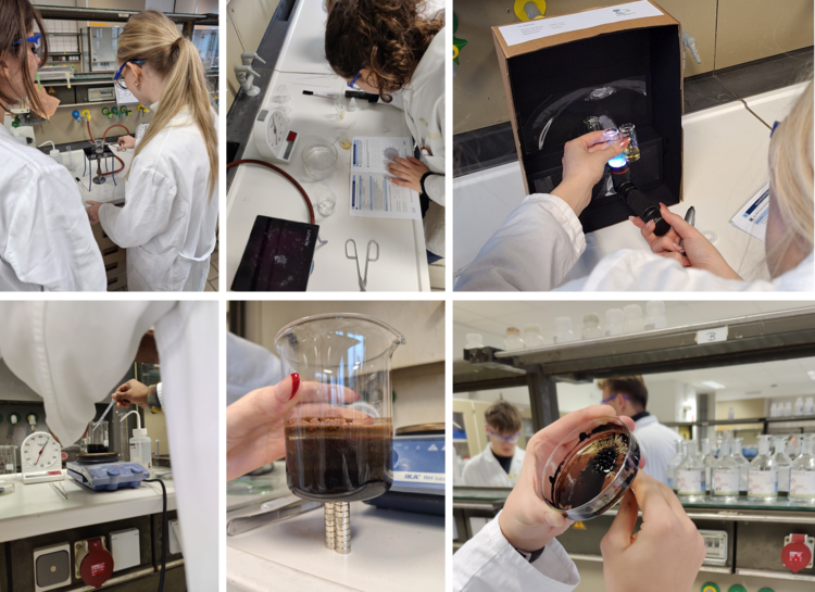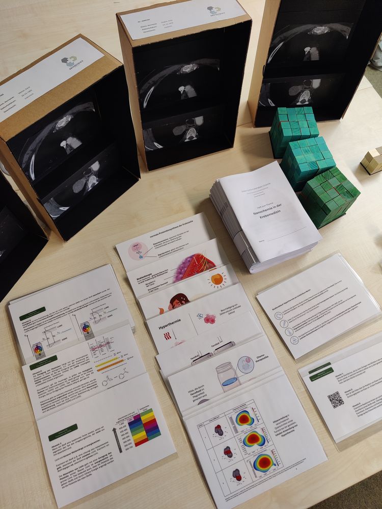 Am 17.12. konnten die Schüler:innen schließlich praktisch in unseren Laboren arbeiten. In unserem Projekt „Nanochemie in der Krebsmedizin” (Teil des Promotionsprojekts von Elisabeth Dietel) erarbeitete der Kurs eine Definition von Nanomaterialien und untersuchte im Labor, wie verschiedene Nanomaterialien in der Krebsforschung eingesetzt werden. Dafür synthetisierten sie pH-abhängige Carbon Quantum Dots, die für eine verbesserte Fluoreszenz-Bildgebung in der Tumordiagnostik genutzt werden können. Sie stellten außerdem ein eigenes Ferrofluid her und modellierten damit die Therapiemethode der Hyperthermie. Über dem gesamten Tag stand die Frage, wie solche neuen Therapien und deren Erprobung in klinischen Studien zu bewerten sind.