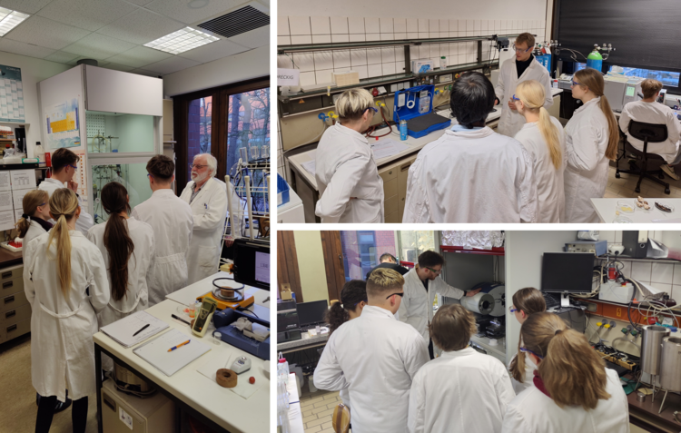 Am 16.12.2025 begrüßten wir den Leistungskurs der Klassenstufe 12 vom Werner-von-Siemens-Gymnasium Bad Harzburg in der Didaktik der Chemie. Malte Petersen und Elisabeth Dietel führten den Kurs durch den Tag und beantworteten viele Fragen rund um Studium, Ausbildung und mehr. Die Schüler:innen erhielten anschließend einen spannenden Einblick in verschiedene Abteilungen der Universität: Alexander Simon führte uns durch die Labore der Arbeitsgruppe Wark und erklärte die Verwendung von Gaschromatograph, Sonnenlicht-Simulator und Glove Box. Willi Rathje begeisterte die Schüler:innen mit einer Führung durch die Ausbildungslabore der Chemielaborant:innen und zeigte uns eine breite Palette von der Aspirin-Synthese über die Auftrennung von Blattfarbstoffen hin zur Extraktion von Farbstoffen oder Fetten aus Lebensmitteln und Genussmitteln wie Pfefferminzlikör oder Spekulatius. Ramona Bartsch und Jonathan Bauschulte wagten sich anschließend mit dem Kurs an die Handhabung einer Gaschromatographie. Eine Messung konnten die Schüler:innen selbst bedienen und auswerten. Bei einer zweiten Messung war eine gute Spürnase gefragt: An unserer GC mit olfaktorischer Einheit konnten die Schüler:innen erschnuppern, welche verschiedenen Stoffe im Extrakt von Kaffee vorkommen.