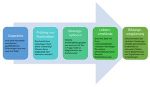 Anhand ausführlicher Gespräche erfassen wir Ihre Bildungsziele, Ihre bisher erworbenen Qualifikationen, Erfahrungen und Kompetenzen und prüfen Ihre Nachweise gründlich. In unserer Beratung geht es ebenfalls um die Darlegung von Bildungsoptionen im pädagogischen Bereich abgestimmt auf Ihre Kompetenzen, wie zum Beispiel: Anpassungslehrgänge, Zugangsvoraussetzungen, Ausbildungs- und Studienformen. Dadurch, dass wir Ihre vorhandenen Qualifikationen prüfen, kann es gegebenenfalls zu Möglichkeiten der Anrechnung kommen.