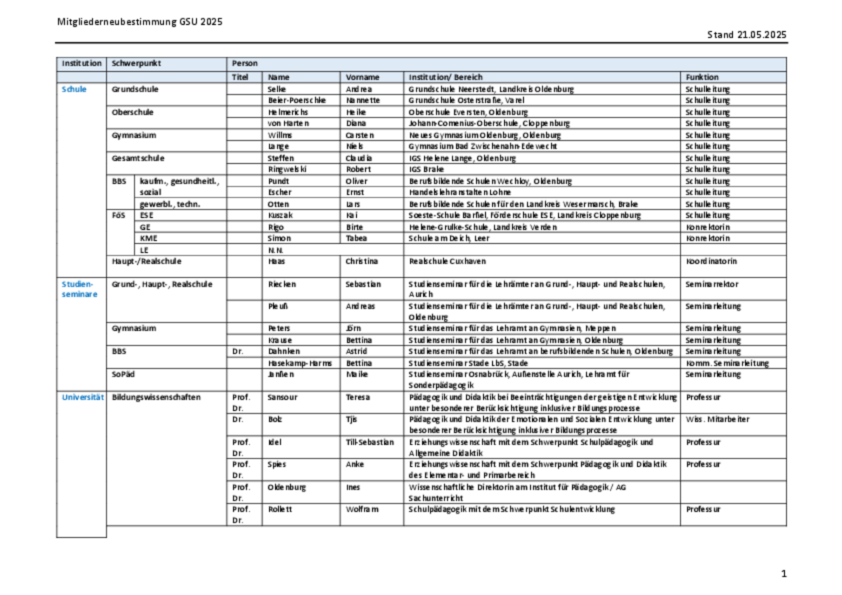 Der GSU setzt sich zusammen aus Vertreter*innen aus Schulen, Studienseminaren und Universität sowie der Lehrkräftefortbildung. Auch die Institution der Regionalen Landesämter für Schule und Bildung (RLSB; vormals Schulbehörden [bzw. NLSchB]) haben langjährig mitgewirkt.