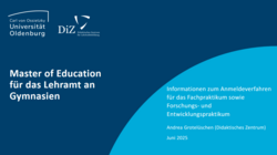 Studierende der Heimatuniversität Oldenburg müssen die vorbereitenden und begleitenden Veranstaltungen zum Fachpraktikum (FP) an der Uni Bremen absolvieren und das vorbereitende und begleitende Seminar zum Forschungs- und Entwicklungspraktikum (FEP) an der Uni OL. Beide Praktika, FP und FEP, finden in einem Zeitraum an einer Schule statt. Für die Zuweisung beider Praktika müssen sich die Studierenden entsprechend der Anmeldezeiten beim DiZ anmelden.