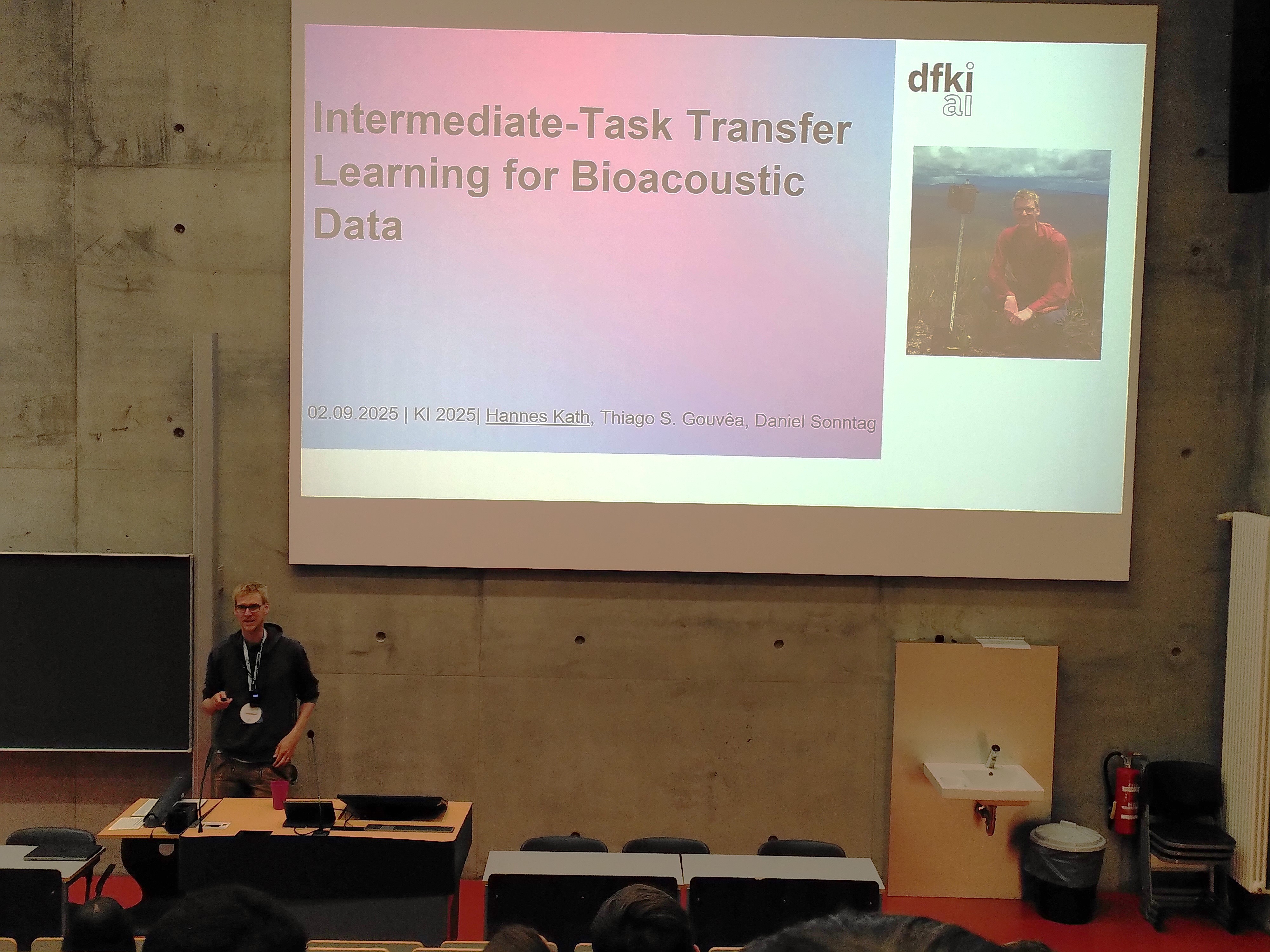 Hannes Kath from the Chair of Applied Artificial Intelligence at the University of Oldenburg and the Department of Interactive Machine Learning at the German Research Center for Artificial Intelligence (DFKI) presented the research paper „Intermediate-Task Transfer Learning für bioakustische Daten” (engl. "Intermediate-Task Transfer Learning for Bioacoustic Data") at the KI2025 conference in Potsdam.