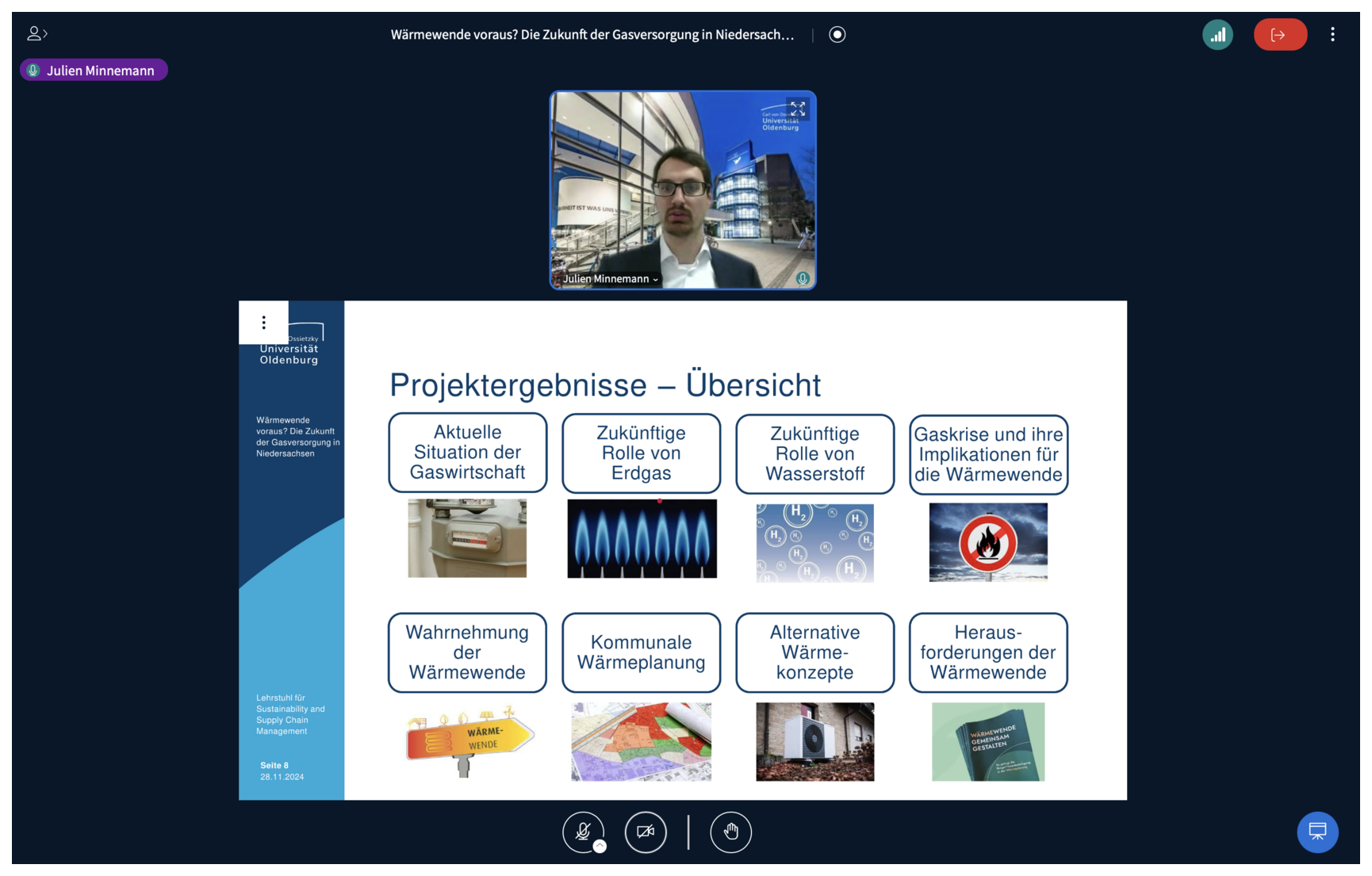 On 28.11.2024, the final event of the project “Wärmewende voraus? The future of gas supply in Lower Saxony” took place.The final workshop discussed the results of an increasing heat transition and what effects this transformation will have on the gas industry in general and municipal utilities in particular. An impulse paper was prepared for this purpose, which summarizes the main results of the project and develops twelve theses that are intended as impulses and discussion points to encourage a debate on them. At the final event, stakeholders from the energy landscape, including municipal utilities, energy cooperatives and private energy suppliers, as well as representatives from local authorities, science and associations, came together digitally with interested members of the public from 10 to 12 h. After the welcome and presentation of the agenda by Prof. Dr. Christian Busse, project member Julien Minnemann presented the central results of the project and explained the theses developed.The participants were then given impulses in the form of two expert presentations. The first speaker was Michael Bußmann from SWTE Netz GmbH & Co. KG from Ibbenbühren on the implementation of and experience with cold local heating. Prof. Dr. Christian Busse as the second speaker then talked about the energy transition in chaotic times and the possibilities and limits of management. Finally, the participants were given an outlook on the current initiatives in the operational and social context of the Chair of Sustaina-bility and Supply Chain Management. The impulse paper (in German) developed in the pro-ject can be downloaded from the project page.