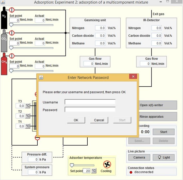 4. Within the booked time your are able to operate the adsorption apparatus. By entering your user name and password you get access to the unit. We recommend to perform the experiments in the given sequence. With a resolution of 1024 x 768 pixel the scheme of the unit will be shown completely with full screen mode of your browser.