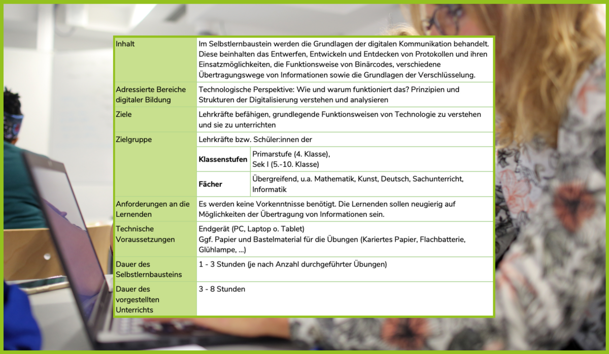 The self-study module "Fundamentals of digital communication" is dedicated to important Computing Science fundamentals of digitalisation, namely the coding and transmission of information. It thus contributes to the understanding of the technological perspective on the digital networked world and serves to answer the question "How does it work?". The functionality of digital technologies can be explored in interactive exercises, for example how images are created in the computer and how they can be sent.