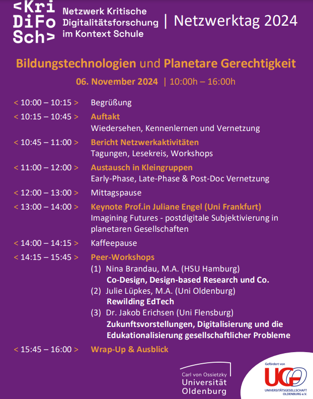 KriDiFoSch Network Day 2024 on 06.11.2024 from 10:00 to 16:00 on the topic ‘Educational Technologies and Planetary Justice’!