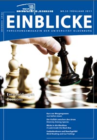 It is a reliable adviser. An important sender of signals. We are, of course, referring to our gut feeling. Without that to-and-fro between chest and pelvis we have a hard time making decisions. Research shows that when the emotional centre of the brain is damaged a patient has enormous problems reaching decisions – even if the rational part is still fully functional. “Decisions” are the subject of this issue of EINBLICKE magazine. What seems so obvious, so commonplace, is in reality highly complex, as the four articles by Oldenburg scientists reveal. The meaning of emotions is just one aspect that the neurobiologists Reto Weiler and Dorothe Poggel examine. They describe a neuroscientific toolkit that helps us to understand the decision-making process. The toolkit used by popular culture to dramatise decisions is made up of different components. “We know what‘s coming and yet we are still terrified” – this is the formula to which the Oldenburg specialist in American culture and languages Martin Butler reduces the narrative paradoxes of the horror film. Pop culture‘s dramatisation of decisions, Butler shows, is linked to fundamental ethical questions. In the EINBLICKE interview, social scientist Berhard Kittel describes how he analyses group decision-making in the laboratory. Mark Siebel looks at decision-making behaviour from a philosophical perspective. This is a conversation about experiment design, free will and the manipulation of decisions. The future of biodiversity research is the focus of marine biologist Helmut Hillebrand and science journalist Anja Fitter. They argue that this area of research should no longer be confined to recording populations. It must reorient itself and forge networks with other disciplines. So why did we decide on this theme for the issue? Because it is an area that Oldenburg scientists from a wide range of disciplines are researching. But in the end, it was down to gut feeling. We wish you a stimulating read!
