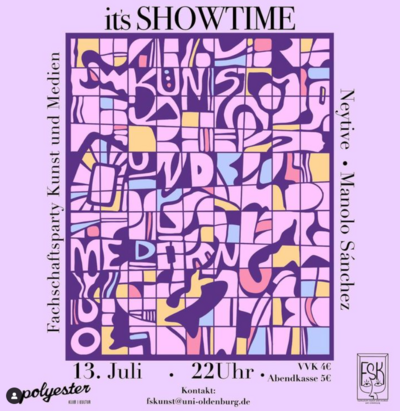 The SHOWTIME is on 05. and 06.07.2023. Opening is on 05.07. at 6 pm in the Prinzenpark. And afterwards we want to continue celebrating together at Polyester. The Klubmitte x Showtime afterparty starts at 10 pm, VVK tickets can be purchased for 4 euros via paypal: FSKunstOL, in the Mensa foyer or directly from the FSR members. We look forward to seeing many of you in the polyester and dancing together to the finest electronic sounds!