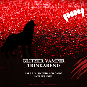 The Glitter Vampire Evening will take place on 15 May from 7pm in the frei_raum, with and without alcoholic drinks, we will toast to the glittering vampires and ask ourselves whether we belong to Team Vampire or Team Werewolf...