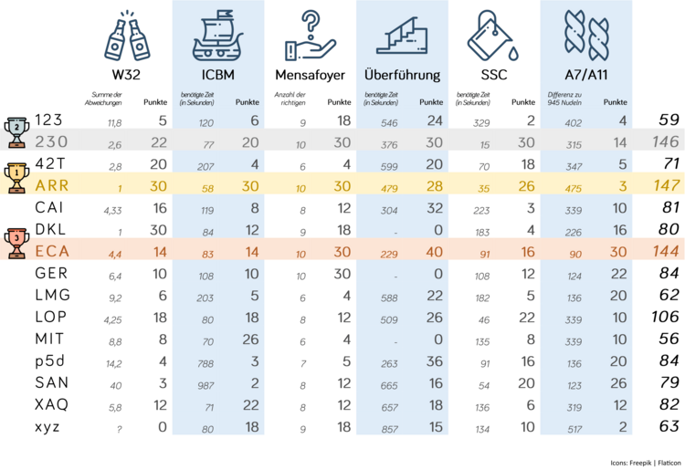 With a score of 147 points, team "PiRaten" managed to narrowly beat team "Team 23" into second place with a total of 146 points. The "Eric cum Andere" team came in third place with a score of 144 points.