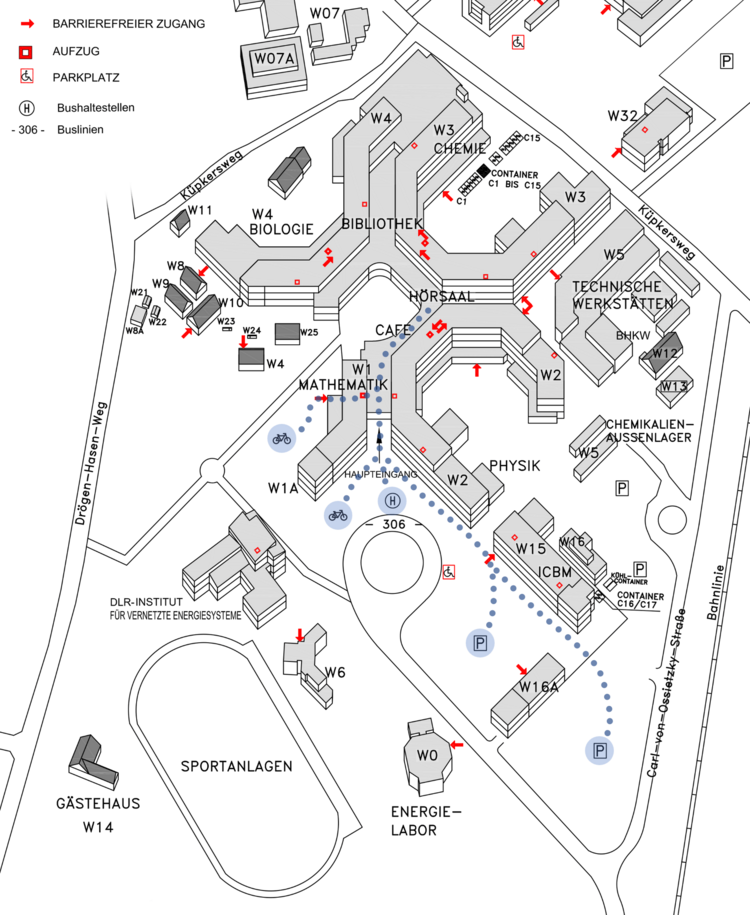 Mit öffentlichen Verkehrsmitteln gelangt ihr vom ZOB mit der Buslinie 306 „Universität” zur Endhaltestelle „Campus Wechloy”.