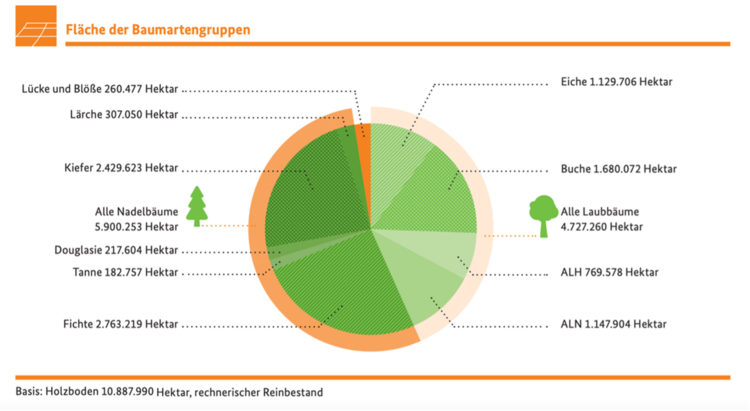 Currently, spruce, pine, oak and beech account for 73% of the area of forests in Germany, with the species having different regional focuses: