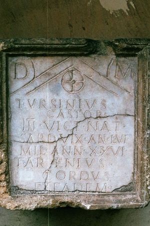 ![]() | T = Titus VRSINIVS = Ursinius CASTOR = Castor III VICT = Warship "Victoria" NAT SARD = Born in Sardinia VIX AN LVI = Lived 56 years MIL ANN XXVI = 26 years Roman soldier T = Titus AR = Arenius CORDUS = Cordus EX EADEM = Likewise |