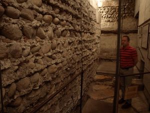 After this explanation, we were taken a little deeper underground and were able to see the foundations of a medieval tower next to the Roman roads. The base was almost square and its masonry was well preserved. However, the tower was no longer impressive in terms of completeness, as a large proportion of the stones had been reused by previous generations for houses or roads. It was fascinating to see how the Roman road and the medieval tower differed in their construction methods. While the Romans had used large stone blocks for their buildings, the foundations of the tower from the Middle Ages were more like a collection of stones from a river bed, with occasional stone blocks from the Roman road worked in.