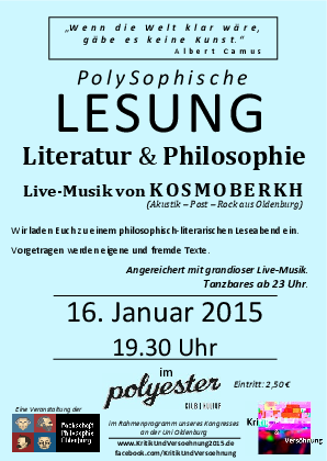 On the second evening, we can gather from 7.30pm at Polyester, a club and cultural venue in Oldenburg city centre. A philosophical reading will take place here, in which participants of the congress, but also people from the neighbourhood, can present their thoughts on philosophy and, if possible, especially on our topic 'Critique and Reconciliation' in a creative way. If you would like to actively participate, please contact us by the end of December at with a few lines about your ideas.