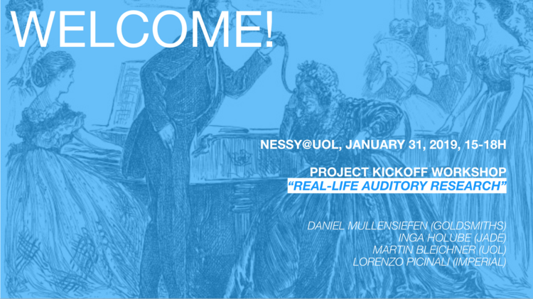 We hosted a nice kickoff workshop entitled "Real-life auditory research" to get a good start into the new year and get into the new project. The workshop focussed on research approaches that go beyond classic lab based paradigms and featured talks by Kai Siedenburg, Daniel Mullensiefen (Goldsmiths University of London), Inga Holube (Jade Hochschule, Oldenburg), Martin Bleichner (University of Oldenburg), and Lorenzo Picinali (Imperial College London).