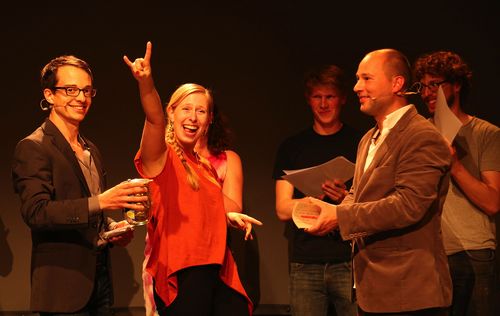 Science presented in an understandable and entertaining way: Bianca Brüggen, Maurits Halbach and Oliver Richters are the winners of the university's 6th Science Slam, which attracted around 150 spectators to the Exerzierhalle.