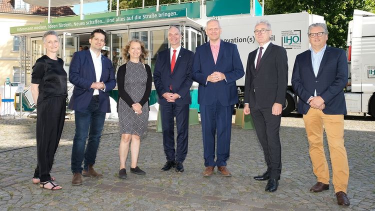 At the closing event, IHJO employees presented examples of the transfer formats implemented around the university study locations of Oldenburg, Wilhelmshaven and Elsfleth at various stands. For example, the "SchülerWissen" sub-project presented teaching materials and experiments from events that brought research topics from the universities to schools. Guests were able to explore the "Innovation(s) Campus" with several 3D printers, a digital laboratory and coworking spaces on a virtual tour. The IHJO's mobile research platform, the Science Truck, was presented in the castle courtyard.
