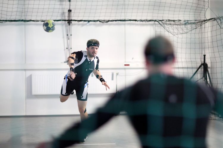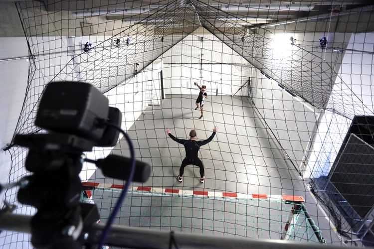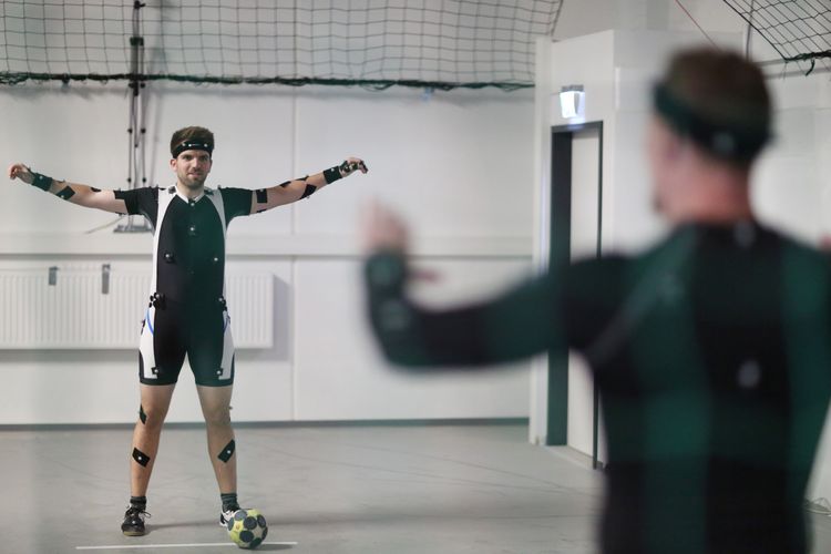 In her dissertation, Josefine Panten is analysing the movements of handball players when taking a penalty throw from seven metres. Her question: How exactly does the thrower manage to mask his attacking action? She collects the necessary kinematic data using a so-called "motion capture system": movements are visualised in virtual space. The picture gallery shows how Panten proceeds and what infrastructure is available to her for this purpose.