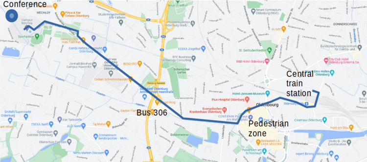 There is a direct bus service from/to the city centre (incl. the central station): the campus Wechloy is the end station of the bus 306 (the bus passes every 15 minutes, the ride to the city centre takes 10-15 minutes). Ticket prices (June 2022, no responsibility is taken): single ticket: 2,55€ (can be bought from the bus driver), package of 4 single tickets: 8,40€, 7-days-ticket: 19,40€ (these can be bought at the ticket vending machines "VWG" around the central train station and the big bus stops like Lappan, Schlossplatz, Staustrasse): check the official page of the local bus company VWG for more information.