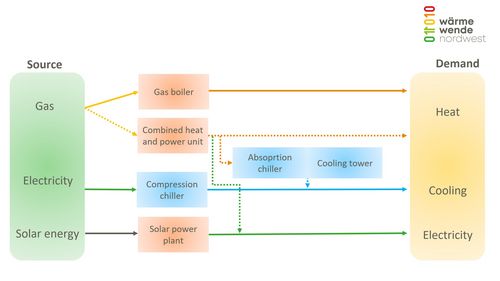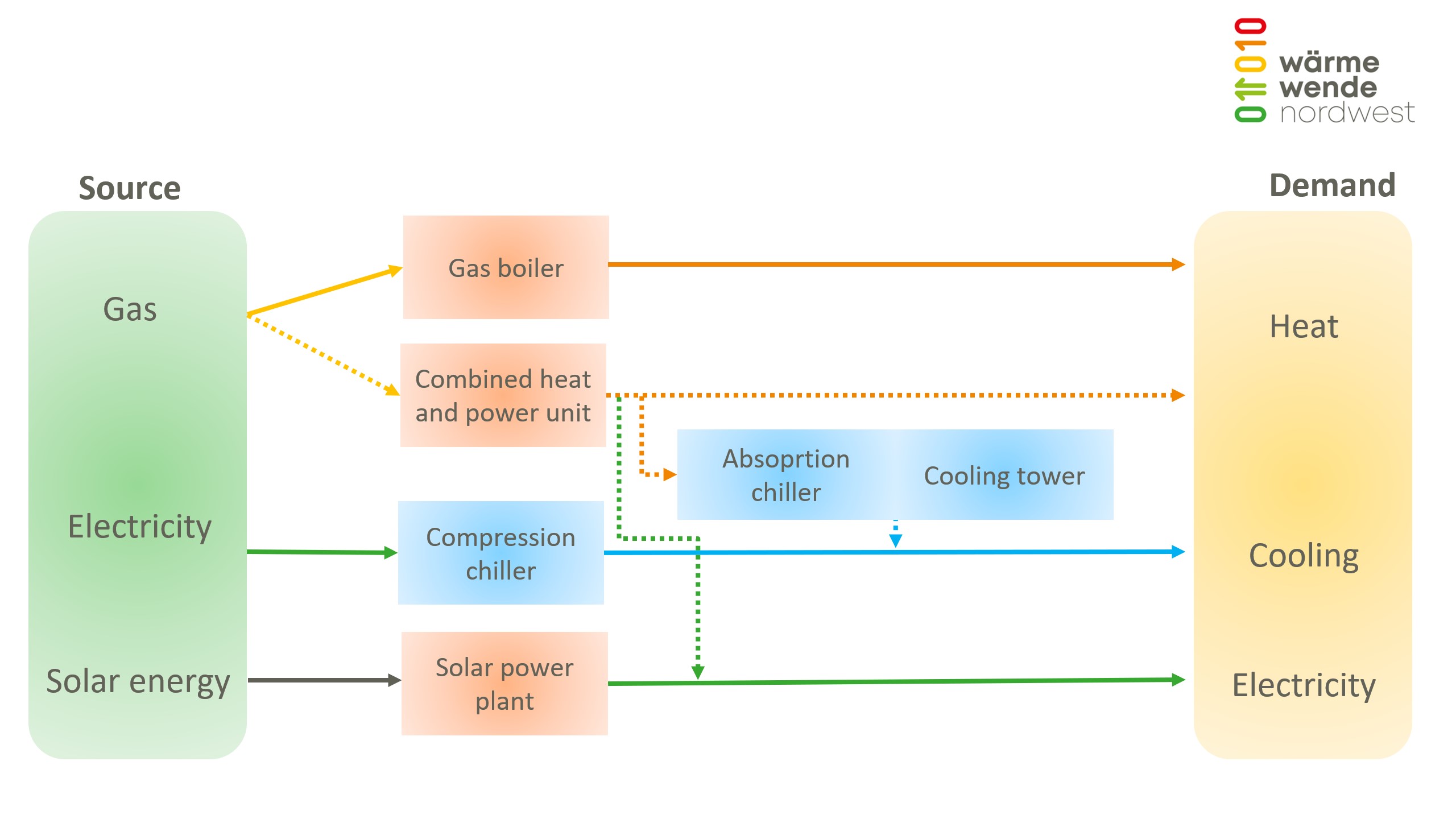 Secondly, in order to take advantage of the synergy effect, it is necessary to link different processes such as cooling, heating, power generation and ventilation. This coupling is demonstrated in Figure 2.