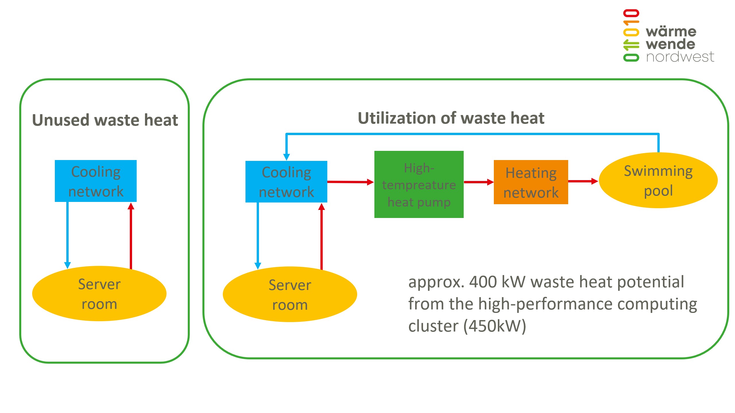 For the heat transition, it is not just about minimizing energy consumption, but also using energy as efficiently as possible and using “by-products”, such as waste heat, sensibly. Around 400kW waste heat from the 450kW high-performance computing cluster can be potentially captured via a high-temperature heat pump. On the other side, there is a constant consumer of the heating at the University, which is a swimming pool.
