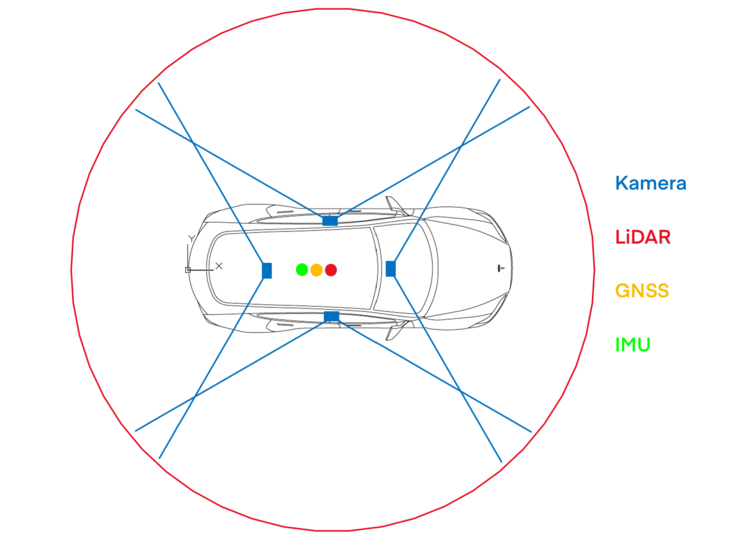 Four cameras are attached to the ego vehicle: a front camera in the rear-view mirror mount, one camera each on the left and right B-pillars and a camera in the centre of the rear window. The positions of the front, left and right cameras exactly mirror those of the Tesla Model 3. The rear camera has been moved slightly towards the centre to reduce the blind spot. The Ego vehicle also has a LiDAR sensor, which is positioned in the centre of the roof. In addition to the cameras and the LiDAR sensor, the car also has a GNSS and IMU sensor. Both sensors are installed in the centre of the car.
