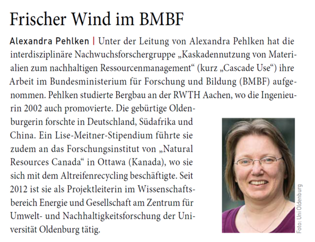Alexandra Pehlken (42) studied mining at the Rheinisch-Westfälische Technische Hochschule Aachen (RWTH Aachen) where she also gained her doctorate as engineer in 2002. The scientist, who was born in Oldenburg, has carried out research in Germany, South Africa and China. Furthermore, a Lise-Meitner-Scholarship brought her to the ‘Natural Resources Canada’ Institute in Ottawa (Canada), where she dealt with the recycling of used car tires. Pehlken also led several research projects, for example, a project on feed production at the ‘Institute for Integrated Product Development’ (BIK) at the University of Bremen. Since 2012, the engineer has been working as a project leader in the field of energy and society at the Center for Environmental and Sustainability Research (COAST) of the University of Oldenburg. Besides, she is involved in national and international panels. In 2011, Pehlken was appointed Associated Junior Fellow at the Hanse-Wissenschaftskolleg Delmenhorst (HWK).