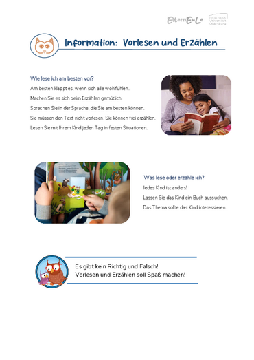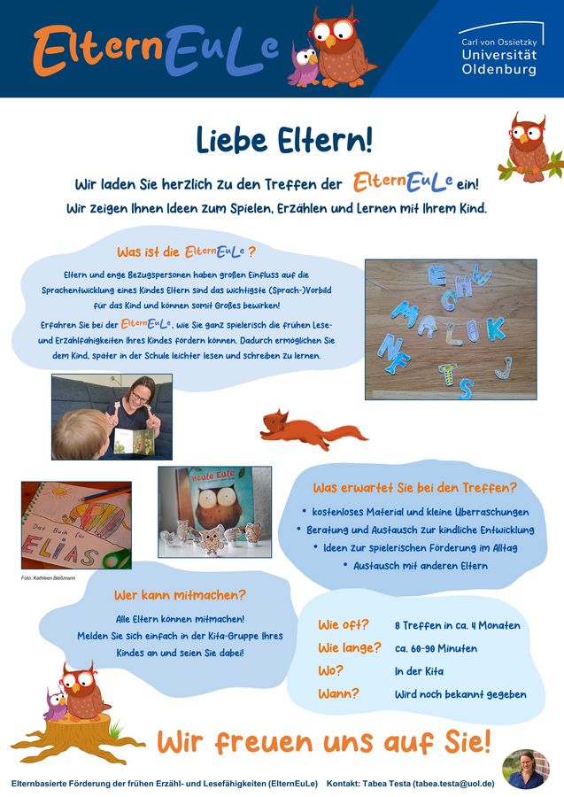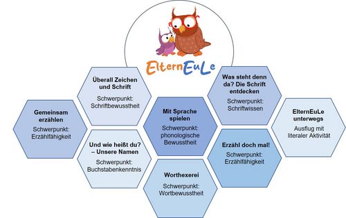 Die ElternEuLe (Elternbasierte Förderung früher Erzähl- und Lesekompetenzen) ist ein Programm, das sich an Eltern und Bezugspersonen 4-6jähriger Kinder richtet. In insgesamt acht Veranstaltungen werden Informationen und Anregungen zu Fördermöglichkeiten der kindlichen Early Literacy-Kompetenzen im Alltag gegeben. Eltern können sich in diesen Veranstaltungen untereinander austauschen und es werden einfache Fördermaterialien für zu Hause hergestellt. Die Freude und der spielerische Umgang mit literalen Inhalten stehen dabei im Vordergrund.