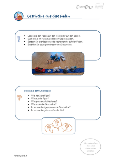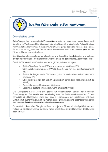 Zu dem Programm der ElternEuLe liegt ein Durchführungsmanual vor. Darin werden die konkrete Durchführung, benötigtes Material, benötigte Zeit und Ziele detailliert beschrieben, um die Umsetzung der elternbasierten Förderung zu erleichtern. Die „ElternEuLe“ enthält neben dem Manual auch Material, das direkt in den Elterntreffen zum Einsatz kommen oder den Eltern mit nach Hause gegeben werden kann.