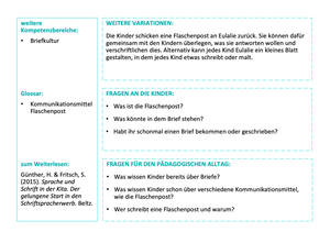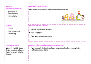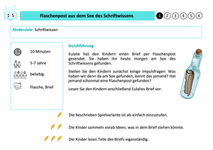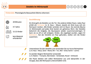 Die dazugehörige Förderschatzkiste enthält insgesamt 103 Ideen für analoge, alltagsintegrierte Förderspiele und 31 Förderimpulse im Karteikartenformat, die sechs Early-Literacy-Komeptenzbereichen zugeordnet sind: Schriftbewusstheit, Schriftwissen, Wortbewusstheit, phonologische Bewusstheit, Buchstabenkenntnis und Erzählfähigkeiten. Mit ihnen kann die frühe literale Kompetenz in jeder Alltagssituation der Kita gefördert werden. Die Förderung kommt allen Kindern zugute.Die Vorderseite der Karten enthält eine kurze, illustrative Beschreibung des Spiels, Hinweise zu geeigneten Alltagssituation (z.B. Bilderbuchbetrachtung oder Morgenkreis), zur geschätzten Dauer, zum empfohlenen Altersbereich der Kinder, zur Personenzahl, zur Schwierigkeit und zum benötigten Material für die Umsetzung. Auf der Rückseite der Förderkarten finden sich Ideen für weitere Spielvariationen, mögliche Fragen an die Kinder, Reflexionsfragen für pädagogische Fachkräfte und Tipps für weiterführende Literatur und Materialien.