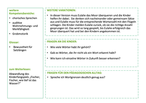 Bei dem Spiel 31 „Rettung im Moor“ wird zur Veranschaulichung eine Bewegungslandschaft mit Reifen ausgelegt, die den festen Boden in einer Moorlandschaft symbolisieren. Alle Kinder bekommen je eine Bildkarte mit einem aus zwei zusammengesetzten Hauptwörtern. Sie verteilen sich außerhalb der Reifen. Ziel ist, dass die Kinder in einem Reifen landen – sonst drohen sie im Moor zu versinken. Sie zeigen nun nacheinander auf die Reifen und sagen das Wort, was im Reifen auf der Bildkarte abgebildet ist, z. B. „Regen“, „Boot“ und „Zahn“. Nun müssen sich die Kinder ihre Bildkarten anschauen und zu dem Reifen rennen, der ihr Wort beinhaltet, z. B. „Regenschirm“ zu „Regen“, „Segelboot“ zu „Boot“ und „Löwenzahn“ zu „Zahn“. Anschließend können die Karten neu verteilt werden. Im Folgenden sehen Sie eine exemplarische Vorder- und Rückseite einer Förderkarte aus dem Bereich Wortbewusstheit: