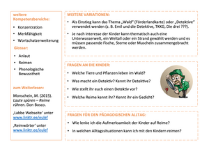 Durch die Impulse und Spiele, die dem Landschaftsbereich Wald zugeordnet sind, werden Kinder zunächst dazu aufgefordert, genau hinzuhören (Lauschspiele). Einen Hörspaziergang (Impuls 37) kann man wunderbar im Wald unternehmen, aber auch in anderer Umgebung. Beim Spiel 39 werden die Kinder zu „Detektiven im Wörterwald“. Ihre Aufgabe besteht darin, Reimpaare zu finden, wodurch die phonologische Bewusstheit im weiteren Sinne gefördert wird. Das Spiel 42 „Waldspaziergang“ ist exemplarisch als Beispiel für die Förderung der phonologischen Bewusstheit im engeren Sinne zu nennen. Alle im Rahmen des (digitalen) oder echten Spaziergangs im Wald entdeckten Wörter werden gemeinsam in Silben segmentiert (klatschen, klopfen, springen). Abschließend werden die Anlaute benannt.