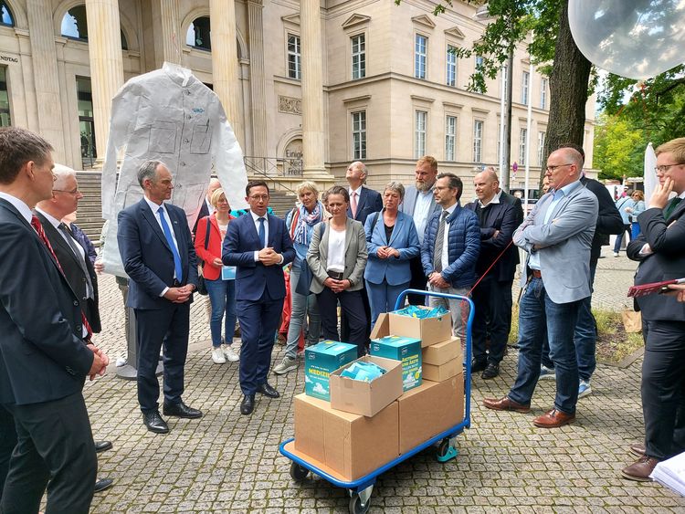 Ein überdimensionaler und vor dem Landtag in Hannover schwebender Arztkittel hat heute die Aufmerksamkeit nicht nur von Politikerinnen und Politikern erregt, die sich in der Mittagspause der laufenden Plenarsitzung die Beine vertreten wollten. Die ungewöhnliche Inszenierung begleitete die Übergabe von insgesamt 19.643 Unterschriften von Menschen aus dem Nordwesten an Wissenschaftsminister Falko Mohrs. Sie alle fordern im Rahmen der Aktion „Ärztinnen und Ärzte fallen nicht vom Himmel“ mehr Medizinstudienplätze in Oldenburg. Damit unterstützen sie den Appell der Universitätsmedizin Oldenburg (UMO) an die Landesregierung, bei der am Wochenende anstehenden Haushaltsklausurtagung den Standort zu berücksichtigen und im Haushaltsentwurf endlich eine angemessene finanzielle Ausstattung vorzusehen.