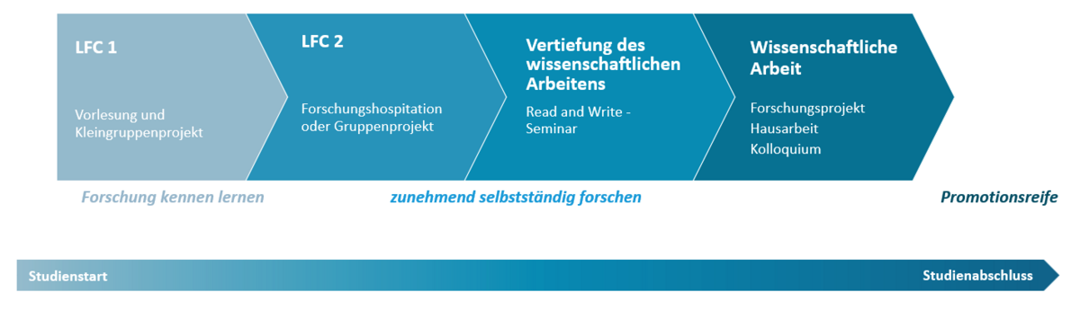 Im Modellstudiengang Humanmedizin ist ein longitudinales Forschungscurriculum (LFC) verankert, das die Studierenden in den verschiedenen Phasen des Studiums absolvieren. Ziel des LFC ist es, die Studierenden in wissenschaftlichem Denken anzuleiten, ihnen grundlegende Techniken des wissenschaftlichen Arbeitens zu vermitteln und Einblicke in Forschungsfelder zu geben. Die Studierenden werden so optimal auf den Umgang mit wissenschaftlichen Erkenntnissen und Fortschritt im ärztlichen Alltag vorbereitet. Nicht zuletzt ebnet das LFC den Weg für die Promotion und eine spätere Tätigkeit als forschende*r Ärztin/Arzt.