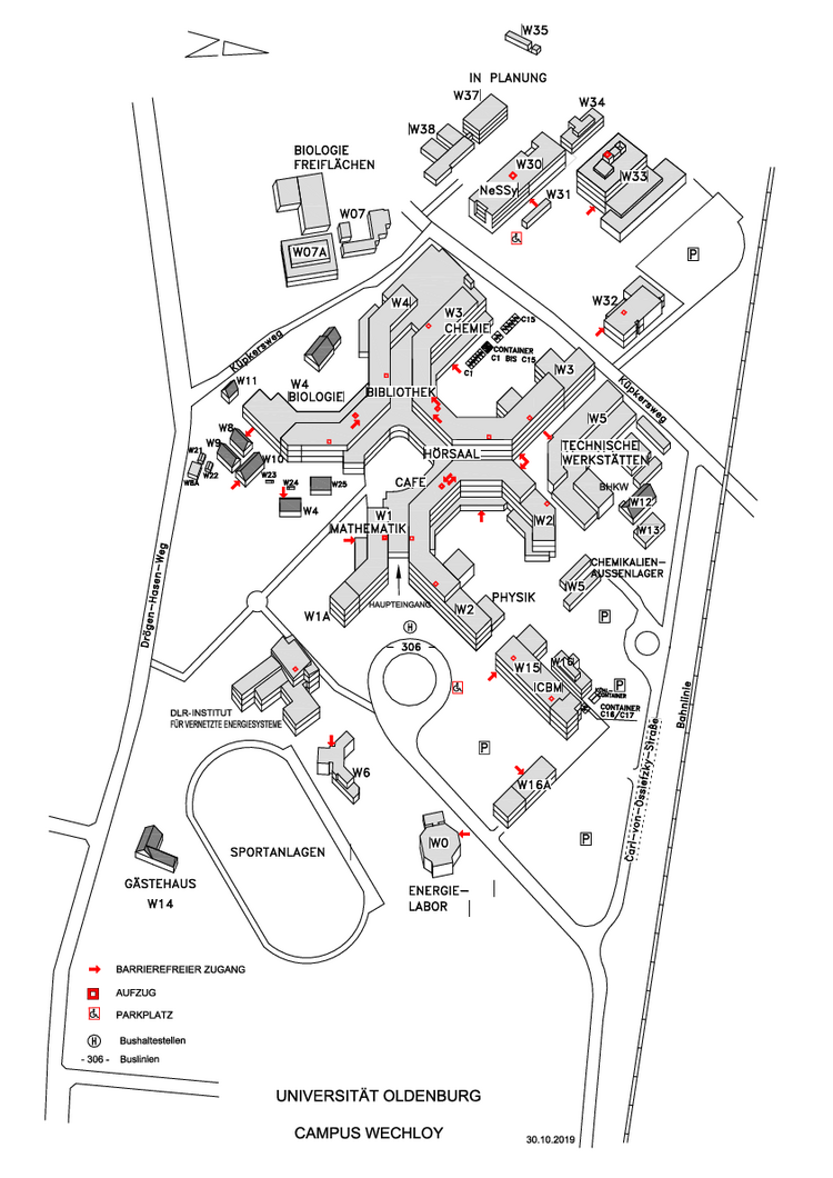 - W3: Der erste Teil steht für den Campus und den Flügel. W steht für Campus Wechloy und 3 steht für Flügel 3, in diesem Flügel befinden sich die meisten Räume der Chemie.