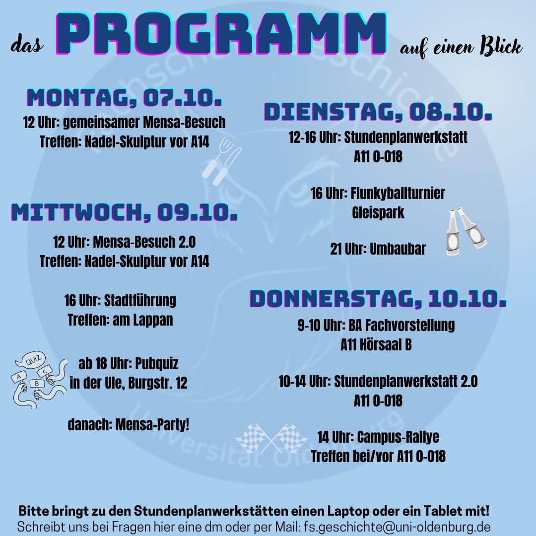 Informationen und Updates zur O-Woche findet ihr jederzeit auch auf unserem Instagramkanal @geschichte_oldenburg. Solltet ihr bereits im Vorfeld Fragen haben, sei es zum Studium oder zum Programm, schreibt uns gerne eine DM oder eine Email an fs.geschichte@uni-oldenburg.de.