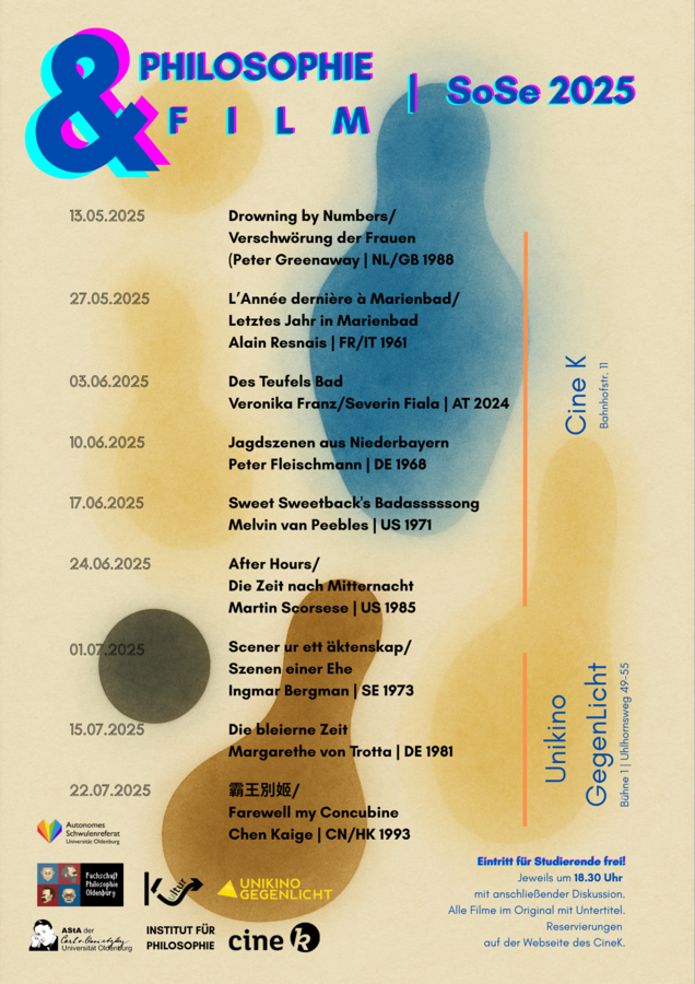 Außerdem richten wir im Wintersemester seit mittlerweile vielen Jahren unter dem Titel „Philosophie und Film“ eine Filmreihe im Cine K aus. In Stud.IP ist sie zu finden über den Veranstaltungsnamen "Philosophie & Film" oder die Veranstaltungsnummer "4.03.997". Die Filmreihe findet dienstags von 18.30 Uhr - ca. 22.00 Uhr (inklusive Diskussion) statt. Die Reihe startet am Dienstag der O-Woche mit dem ersten Film.