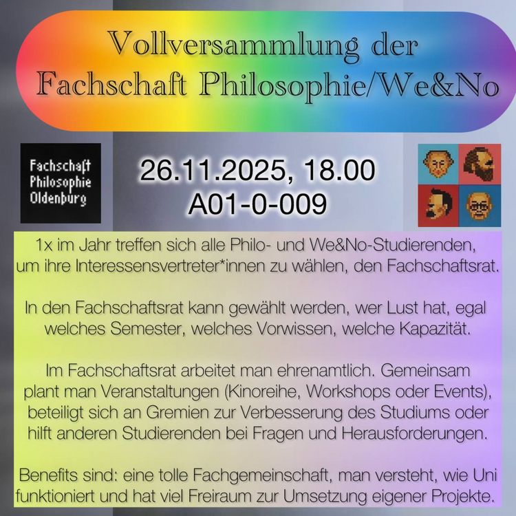 am 26.11.2025 findet ab 18 Uhr im Raum A01 0-009 die diesjährige Fachschaftsvollversammlung statt, zu der alle Studierende der Fächer Philosophie und Werte und Normen eingeladen sind. In diesem Rahmen wird auch der neue Fachschaftsrat gewählt werden. Der Fachschaftsrat hat die Aufgabe, die Interessen der Studierenden gegenüber der Universität zu vertreten, Studierendenberatung zu erbringen und Vernetzung unter den Studierenden anzubahnen. In den Fachschaftsrat kann jede*r gewählt werden, der*die eingeschrieben ist in einen der 7 philosophischen Studiengänge in Oldenburg, egal welches Semester, welches Vorwissen, welche Kapazitäten oder Kompetenzen.