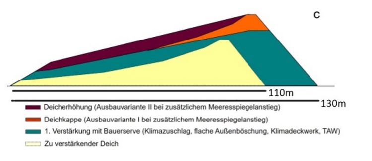 Die heutigen Seedeiche sind etwa 8,5 m hoch und benötigen eine Deichfußbreite von etwa 100m. Müssen die Deiche wegen des Meerespiegelanstiegs erhöht werden, dann müssen sie auch breiter werden (um das Gefälle und die Stabilität zu erhalten) der Flächenbedarf von einem Deich ist also enorm. (noch mehr dazu schreiben?)