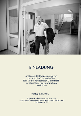 Anlässlich der Pensionierung von Prof. Dr. Karl Müller, Institut für Germanistik der Universität Salzburg, findet am 6. November ein Festkolloquium im Literaturarchiv Salzburg mit Beiträgen aus unterschiedlichen Fachgebieten statt. Der Leiter der AG Angewandte Geographie und Umweltplanung, Ingo Mose, wird dazu einen Vortrag über "Geographische Assoziationen zum (vorläufigen) Vermächtnis des Nationalparks Hohe Tauern" beisteuern. Ingo Mose und Karl Müller sind sich über mehrere Jahrzehnte kollegial und freundschaftlich verbunden und haben wiederholt an der Universität Salzburg interdisziplinäre Seminare mit Studierenden der Geographie und Germanistik zur Wahrnehmung und zum Umgang mit Natur und Landschaft durchgeführt. Zuletzt war Ingo Mose im Sommersemester 2014 mit einem Lehrauftrag am Institut für Germanistik in Salzburg tätig.